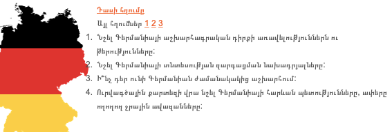 1.Գերմանիայի աշխարհագրական դիրքի գլխավոր առանձնահատկությունն այն է, որ այն գտնվում է Եվրոպայի կենտրոնում, ինչպես ասում են <<սրտում>>:
