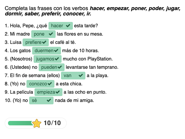 a. son / son b. es / son c. son / es - Mis clases de español empiezan a las seis de la tarde. a. empiezo b. empieza c. empiezan
